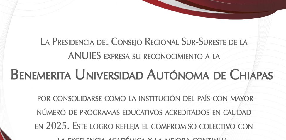 El Consejo Regional Sur-Sureste de la ANUIES expresa su más amplio reconocimiento a la Benemérita Universidad Autónoma de Chiapas (UNACH) por haber sido distinguida como la institución de educación superior del país con el mayor número de programas educativos acreditados en calidad durante 2025.